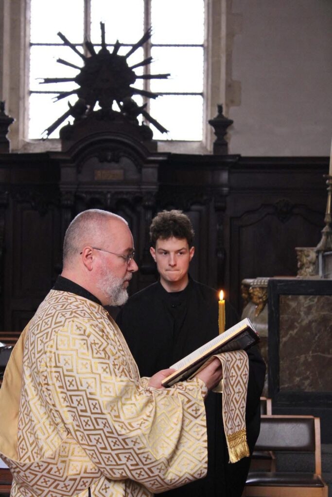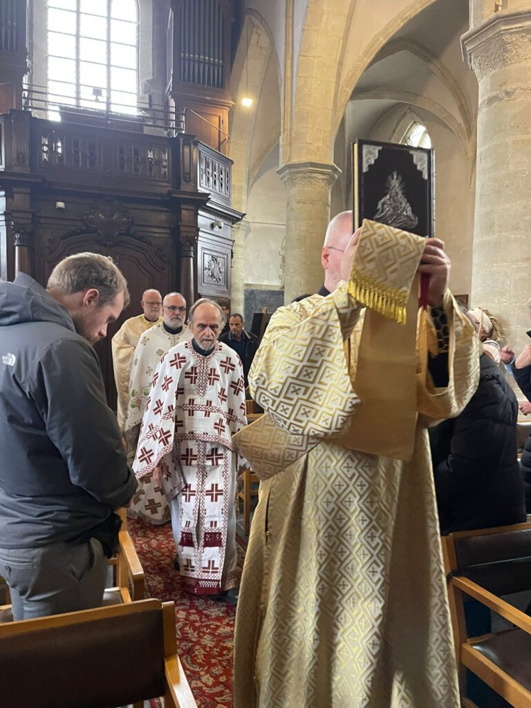 Protopresbyter van de Oecumenische Troon vader Dominique ging voor in de Goddelijke Likturgie, bijgestaan door aartspriester Ioannis Lykos van de naburige parochie van de hh. Georgios & Alena van Dilbeek, vader Filip Boone en diaken Symeon van de parochie van Kortrijk.